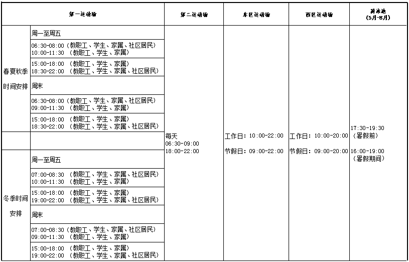 ②体育馆、(校医院)风雨棚球场、西区各运动场地,根据用场需求工作日提前1小时开放。