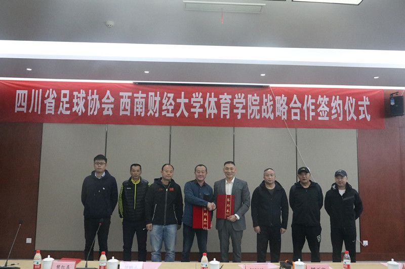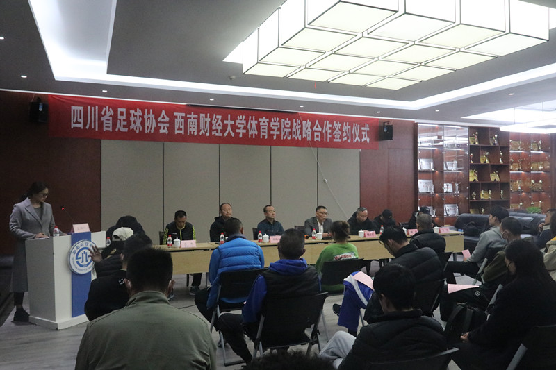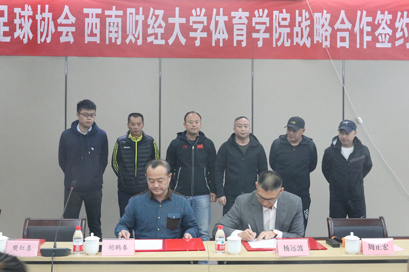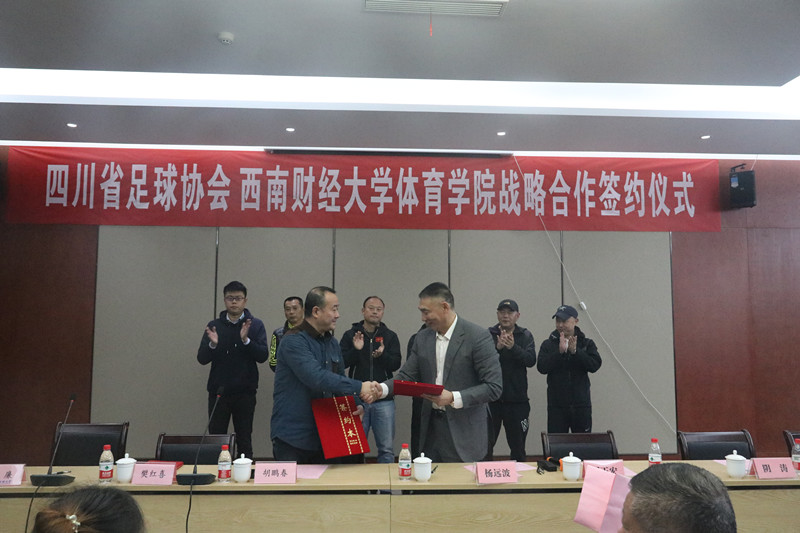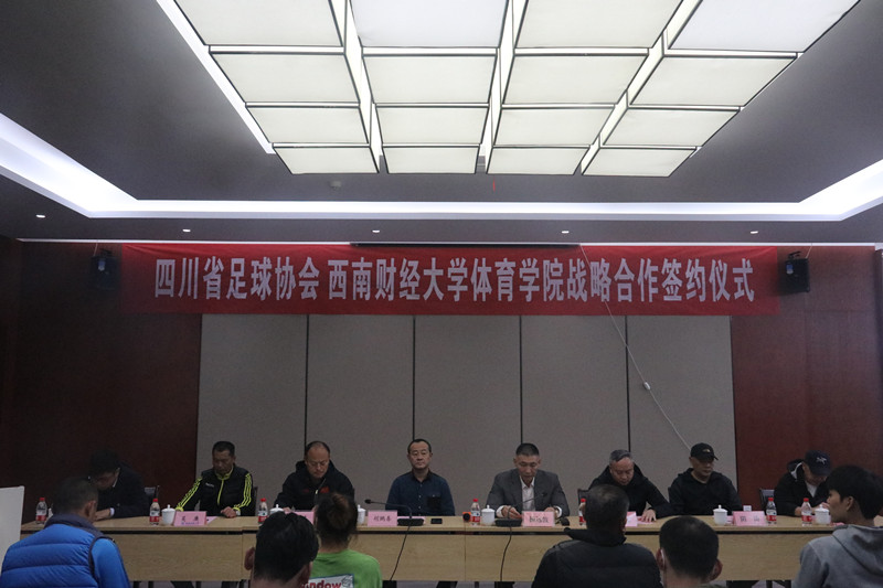 11月3日,四川省足球协会与西南财经大学半岛平台战略合作签约仪式在柳林校区光华体育馆举行。四川省足球协会常务副主席兼秘书长胡鹏春、学院院长兼直属党支部书记杨远波分别代表双方签约。参加签约仪式的还有省足管中心副主任樊红喜,四川省足球协会副秘书长吴廉,半岛平台副院长周正宏、阴涛,副书记李治,院长助理毛艳、陈丛刊及竞技体育系负责人,学校高水平运动队教练,男女足球队运动员等。