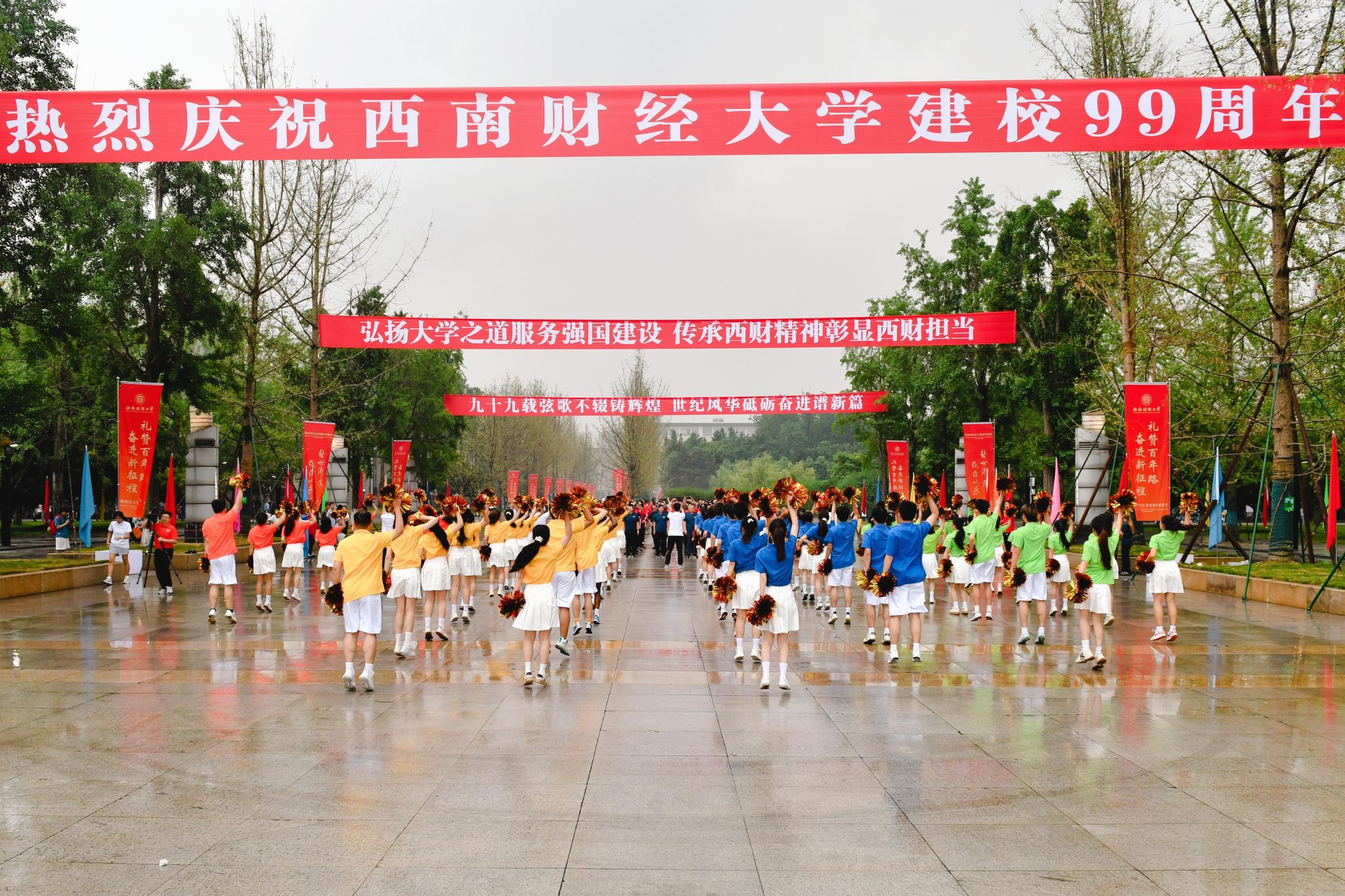 队伍环绕济民广场而行,《我和我的祖国》旋律悠扬,滚烫的爱国情怀浸透一词一句,在场师生校友思绪绵长,大家再次重温体悟学校百年来赓续红色血脉、矢志不渝教育报国的赤诚丹心。经世楼前,年轻的朋友们发出盛情邀约,欢快的鼓点萦绕在耳,如同催征号角,鞭策着全体西财人以更加饱满的姿态迎接百年佳期到来。道路两旁彩旗猎猎,师生们步履矫健,北大门广场歌舞欢腾,赴约百年华诞、共谋发展新篇的洋洋热情感染全场,激励大家怀揣“强国建设、西财担当”的壮志豪情迎向胜利的终点。