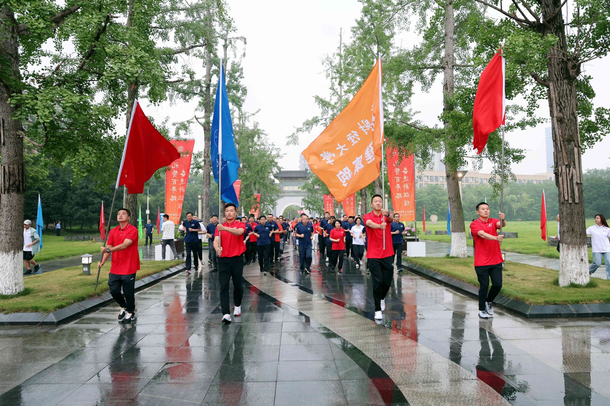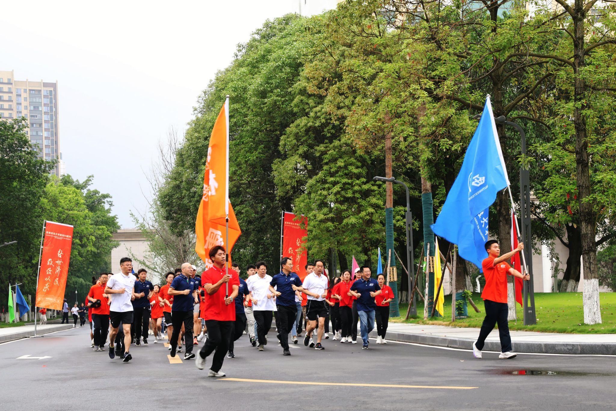 从光华大学门到北大门的跑步路线,宛如一道从黄浦江畔启航,一路铿锵一路芬芳,点亮蓉城华章的历史之光,照耀辉映着西南财大99载与民族共命运、与时代相偕行的峥嵘岁月。队伍从光华大学门出发,沿着光华路上的西财历史文脉,来到济民广场。“百年西财、生日快乐”“经世济民、孜孜以求”的口号响彻济民广场上空,每一声既包含着西财人在百年风华正茂中始终胸怀“国之大者”、心系“民之所向”的家国深情,也饱含西财人在迈向百年、启程新百年的征途中一往无前、踔厉奋进、再谱华章的进取气魄。