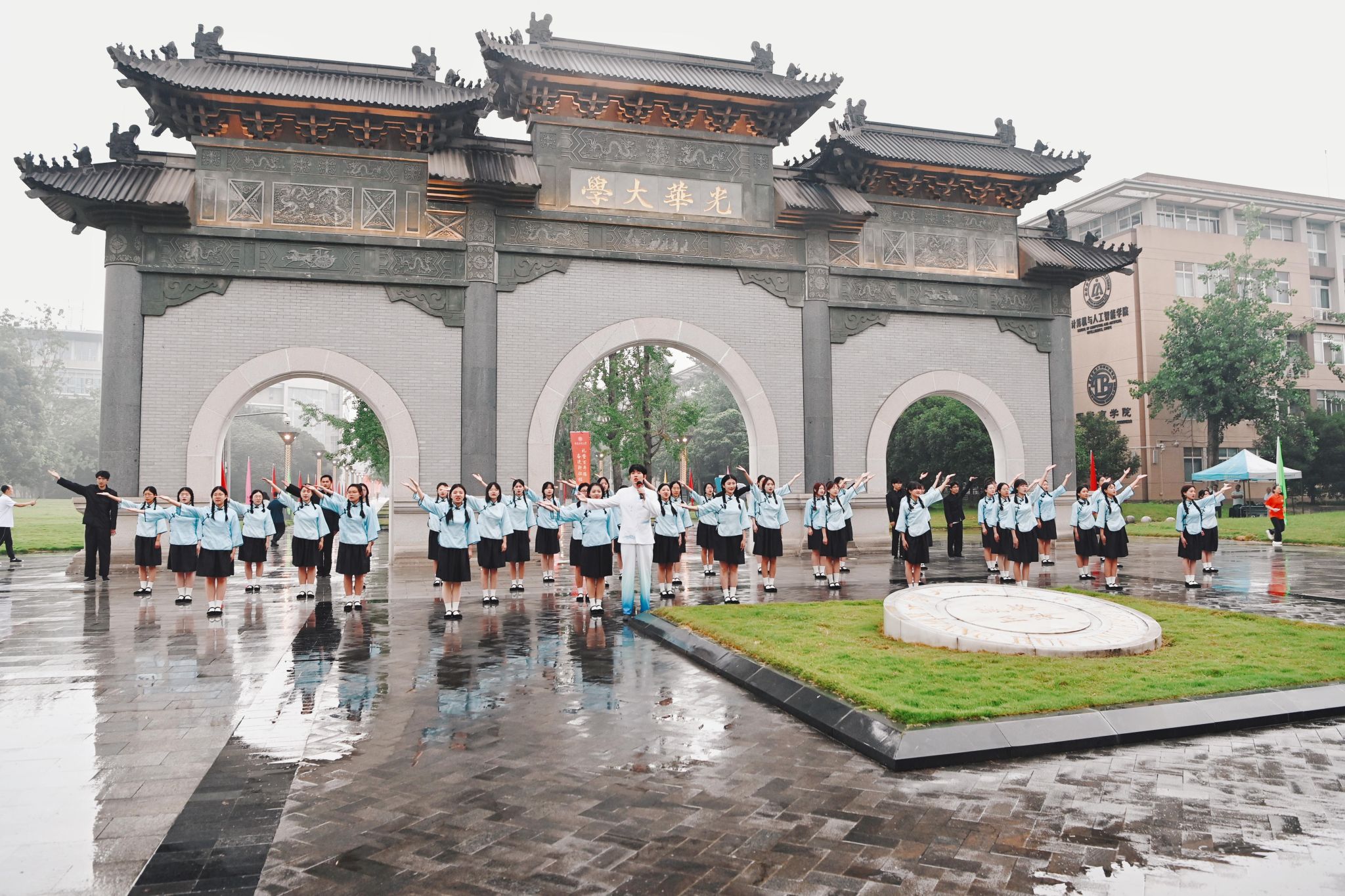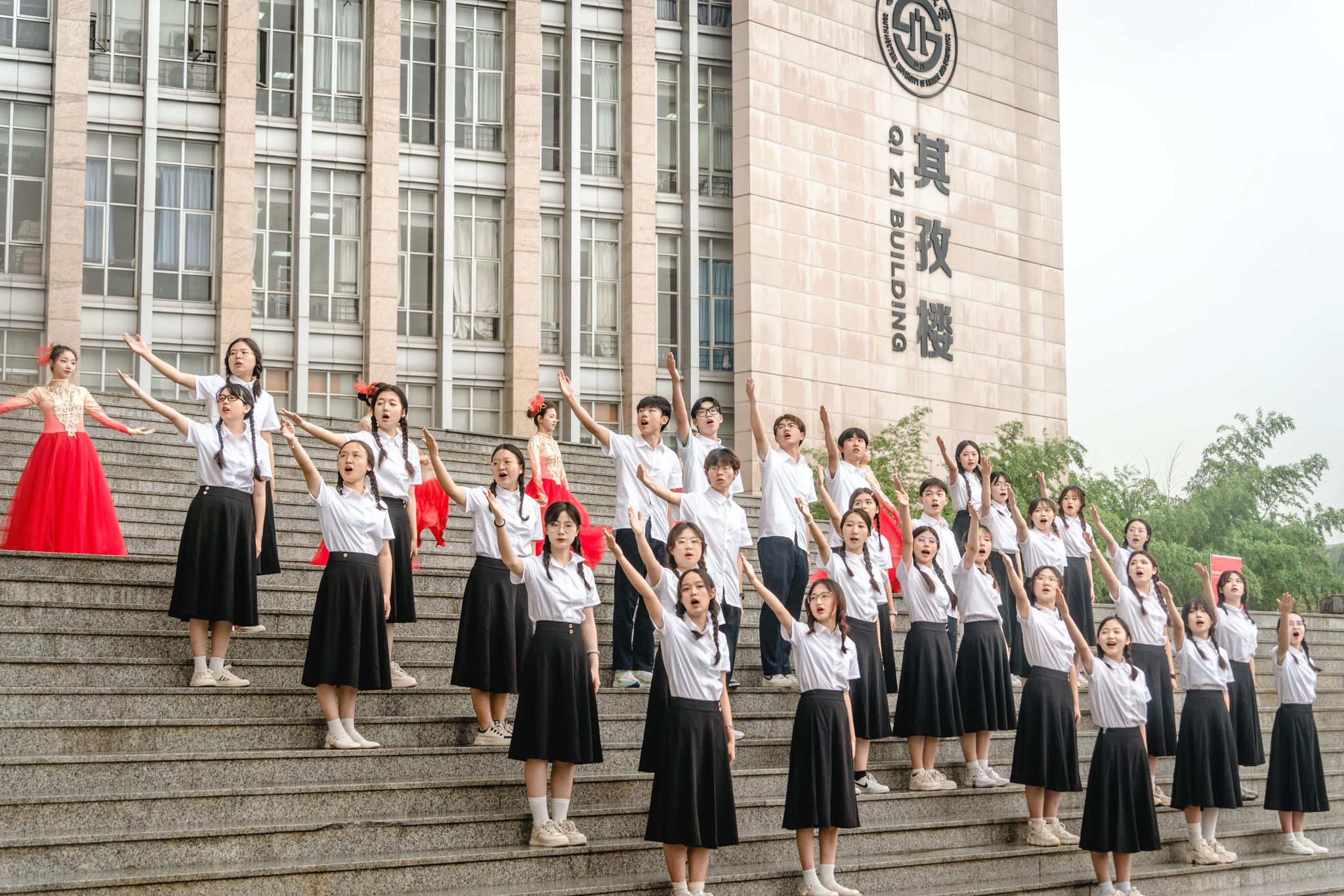 柳林校区光华大学门前,西财学子齐声唱响《光华大学校歌》,在“中华民气原俊伟,奋起自为雄”的咏唱中深情回望学校99载弦歌不辍、兴学报国的辉煌历程,汇聚昂扬起“礼赞百年路、奋进新征程”的磅礴情怀。