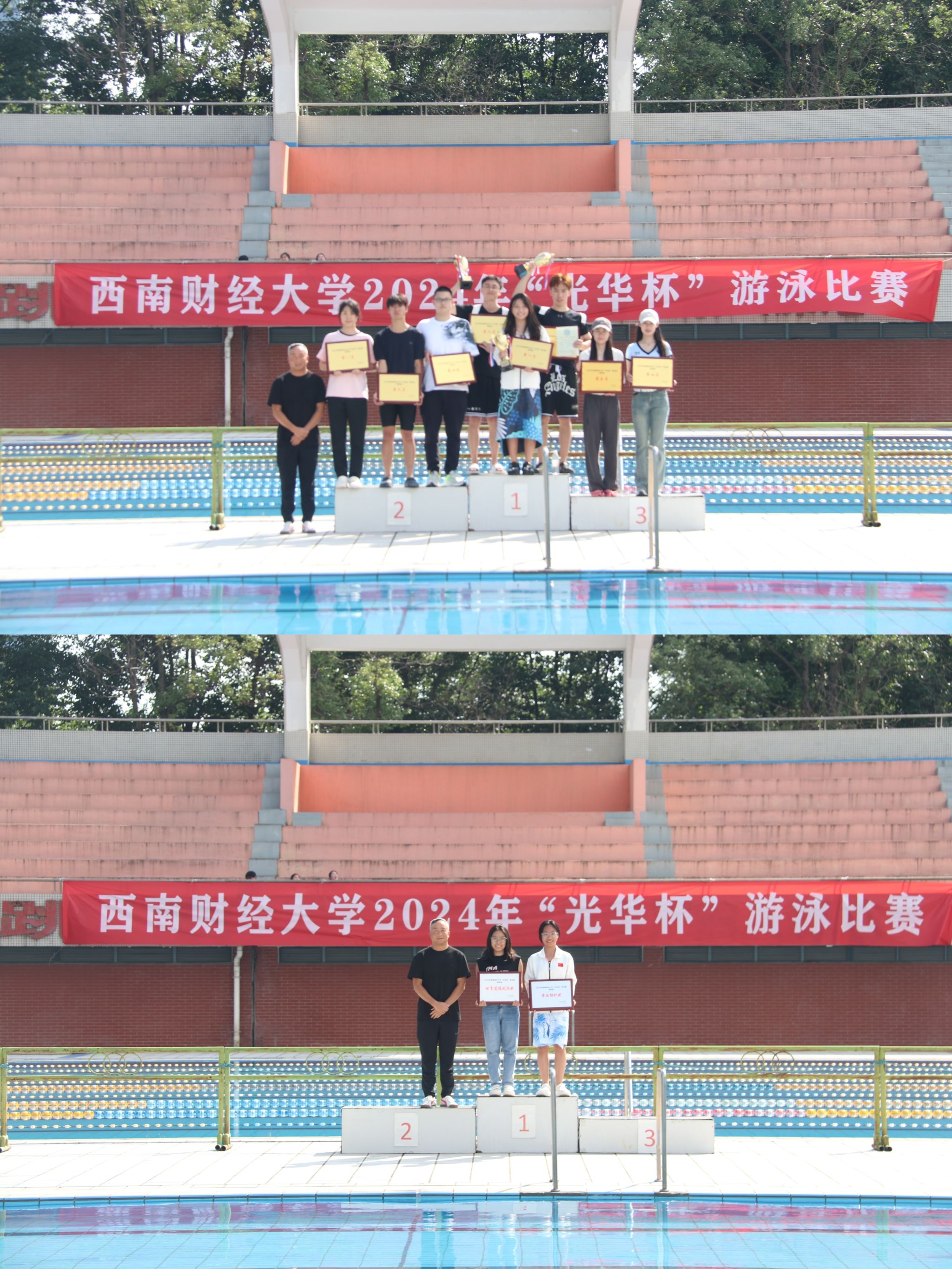 6月11日下午,“礼赞新时代·奋进新征程,迎百年校庆·铸西财辉煌”2024年西南财经大学“光华杯”游泳比赛在柳林校区游泳池圆满举行。半岛平台党委书记周正宏,副院长陈丛刊,副书记李治为获奖学院以及个人颁发了荣誉证书及奖牌。