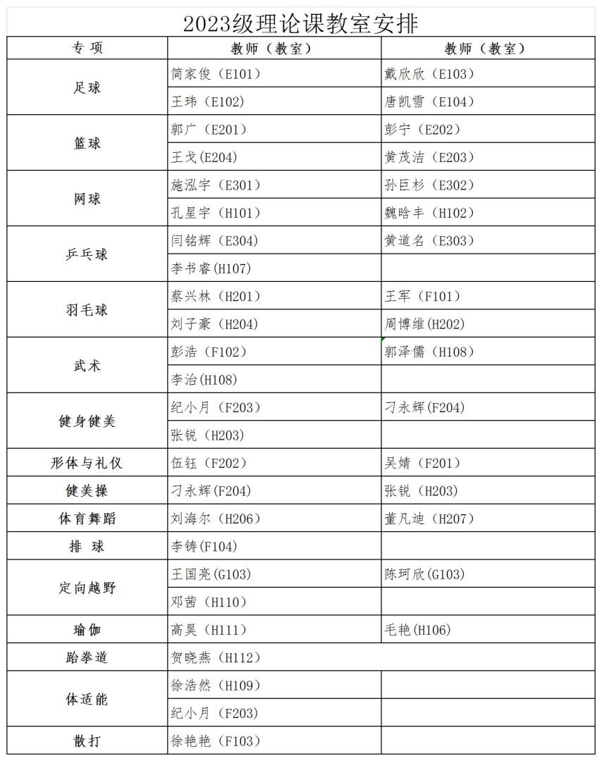 经教务处同意,本学期2023级本科生第3周体育课为半岛(中国)理论课,10月7日起恢复户外教学。根据教室资源状况,现将理论课具体安排通知如下: