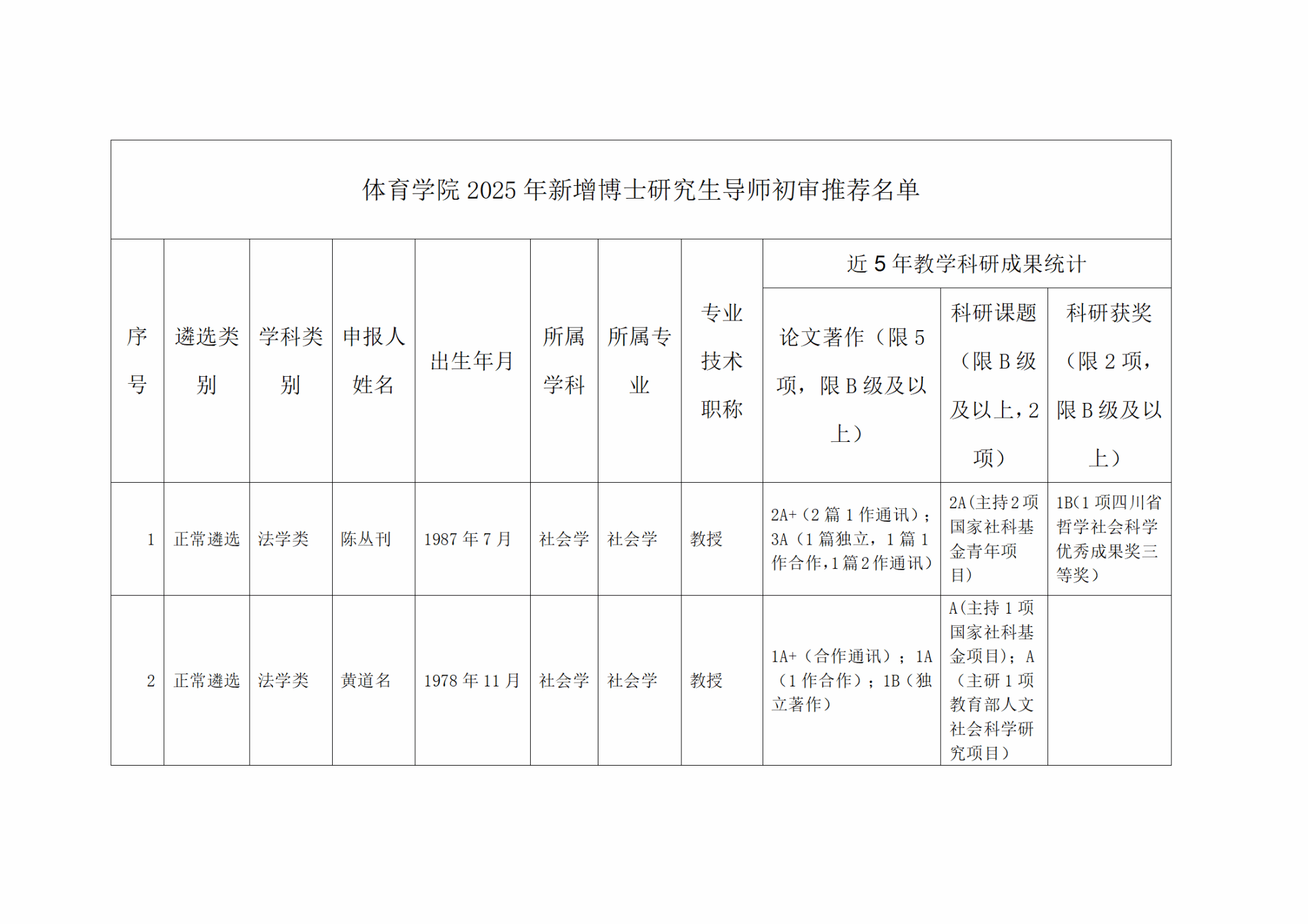 根据《西南财经大学研究生导师岗位管理办法(试行)》(西财大办〔2023〕19号)、《关于2025年新增博士生指导教师遴选工作的通知》要求,经教师本人申请,学院工作人员初审,党政联席会议审查,体育学院学位评定分委会审核,现将本单位初审推荐的2025年新增博士研究生导师名单公示如下(见附件),公示期为2025年10月27日至2025年11月2日。如对公示结果有异议,可在公示期内反馈,联系人:熊老师,联系邮箱:xionglj@swufe.edu.com。