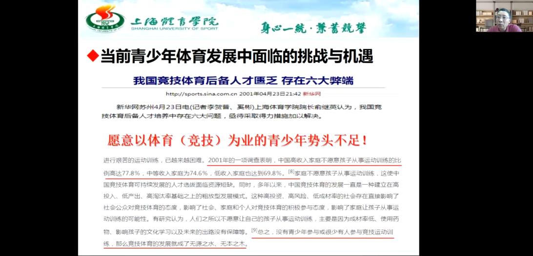 2021年5月12日下午15:30,上海半岛平台副校长、博士生导师唐炎教授通过线上方式,举办了题为《体教融合背景下我国青少年体育发展的思考》的光华讲坛。在外地出差培训学习的半岛平台院长杨远波教授在线主持了讲座,半岛平台研究生及部分教师参加了此次讲座。